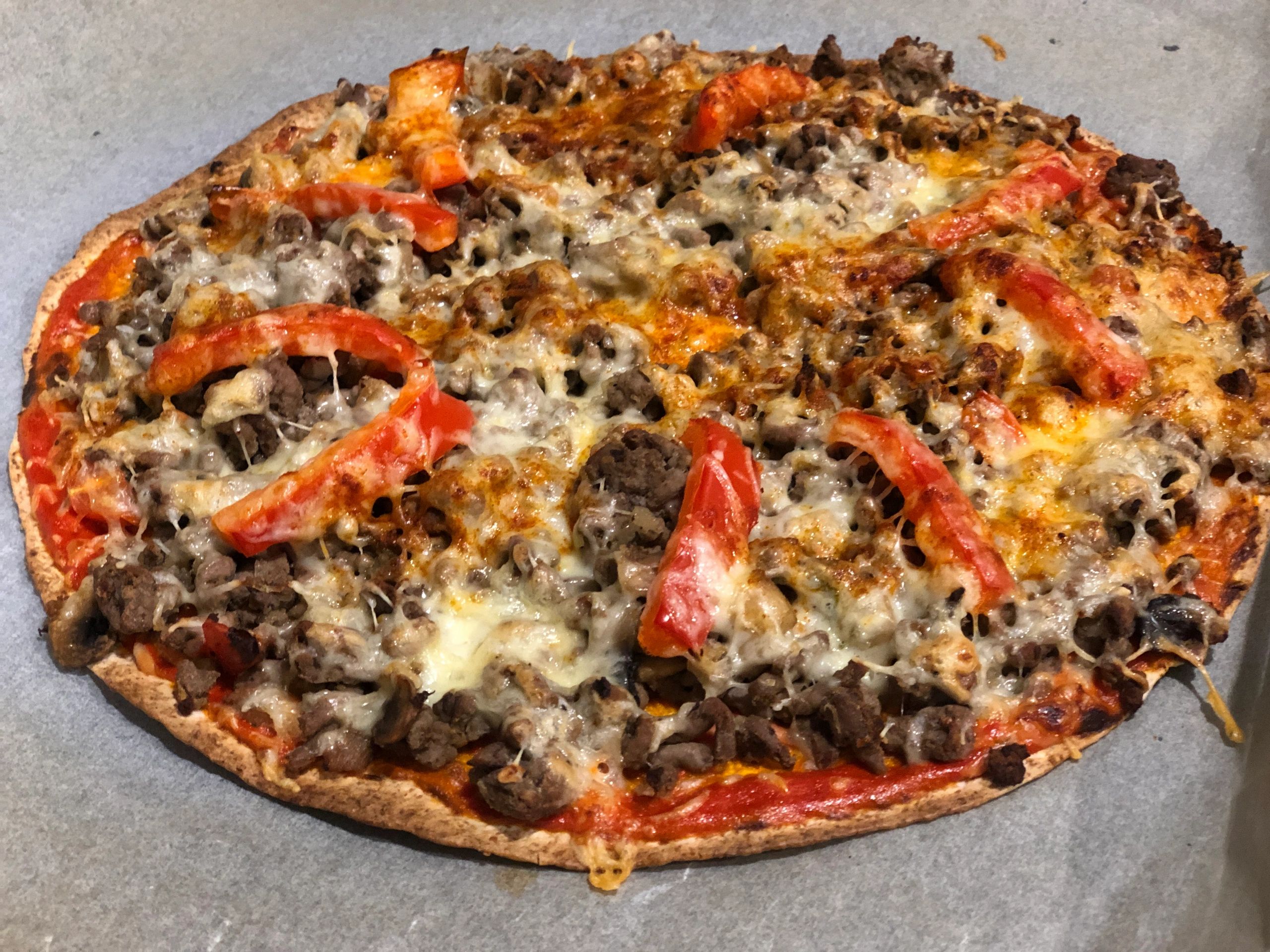 I happened to have a pack of minced beef , tomato paste ,sour cream, salsa , mushrooms, onions and tomatoes and cheese in the fridge today. And of course the tortilla . It was delicious! Slide it in the oven for about 7 minutes on 200c and tadaaa, it’s perfect and so easy.
