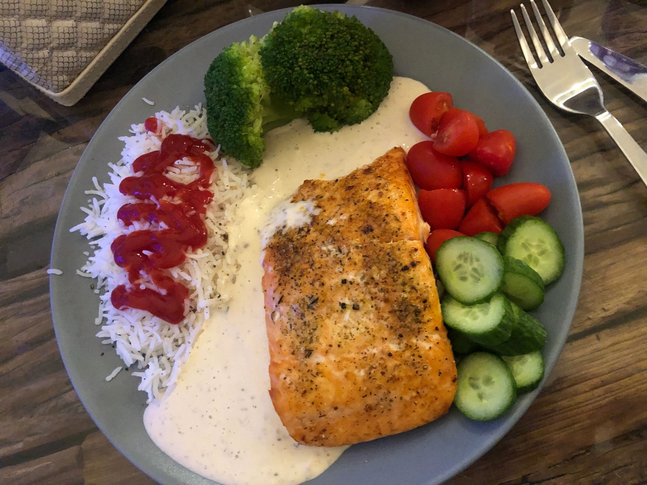 This is seriously the most easiest dish to make period! I have the worst cravings for baked salmon sometimes and it’s good! Healthy and I make it with a creamy yoghurt based seasoned sauce that goes really well with the fish , rice and vegetables. Just put the salmon in a dish with olive oil, salt and pepper and whatever other seasoning you need, maybe some lemon slices underneath the salmon so you avoid it getting stuck to the plate . And that you can keep in the oven for about 25-30 minutes and cook it in 225-250c in the middle then let it cook itself ! So easy, but sooo good ! 😇