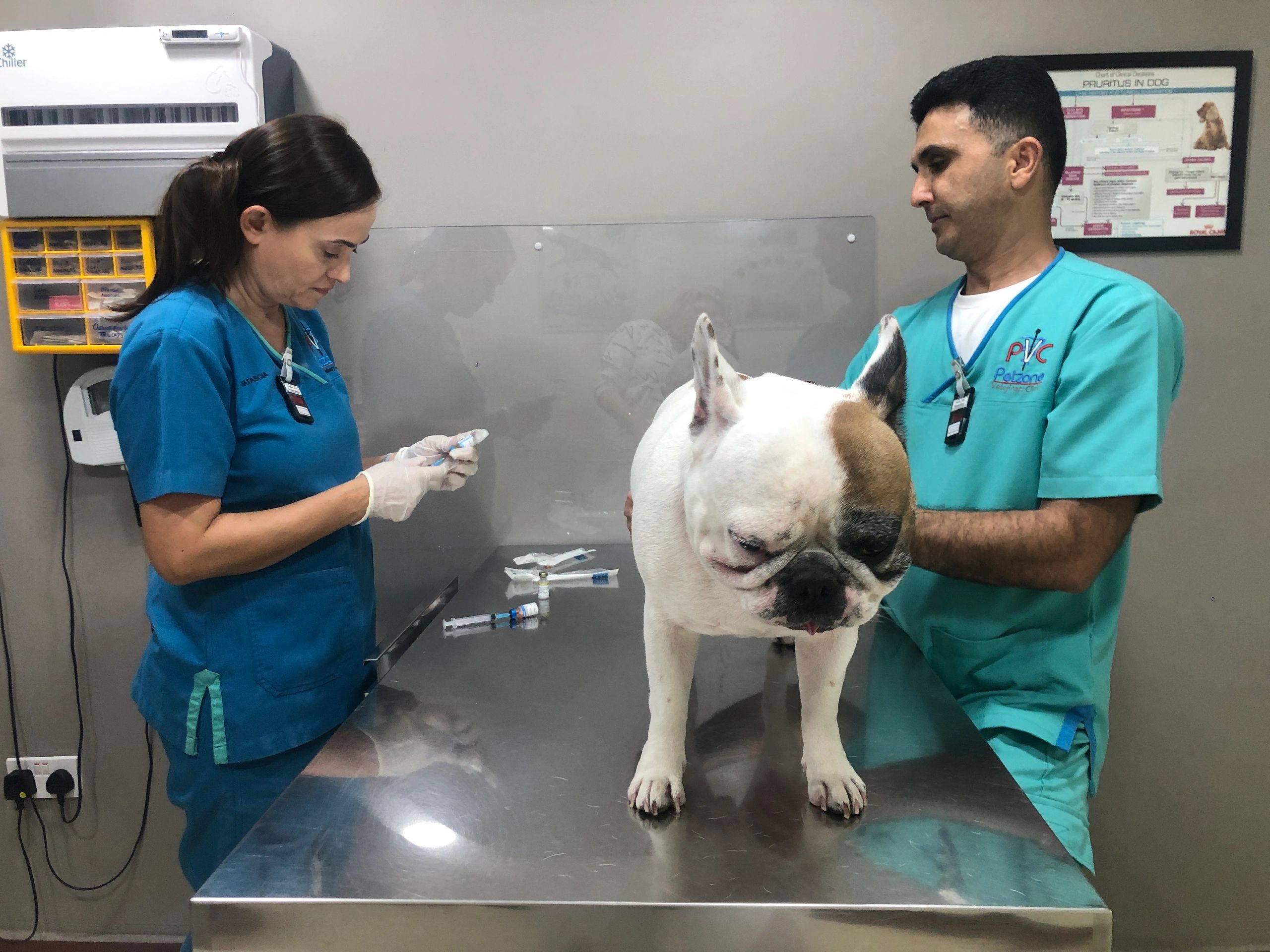 for Rosco‘s yearly vaccines . And he knows it . Poor thing. Luckily Dr.Natasha is super with us and very gentle and the whole thing was over in a flash… how ever, Rosco has gotten so fat. So no more treats and human food for him. I keep telling people all the time to not feed him leftovers or any other food than his first but seems that someone just ain’t listening. So it was good to have that message directly from the doctor .