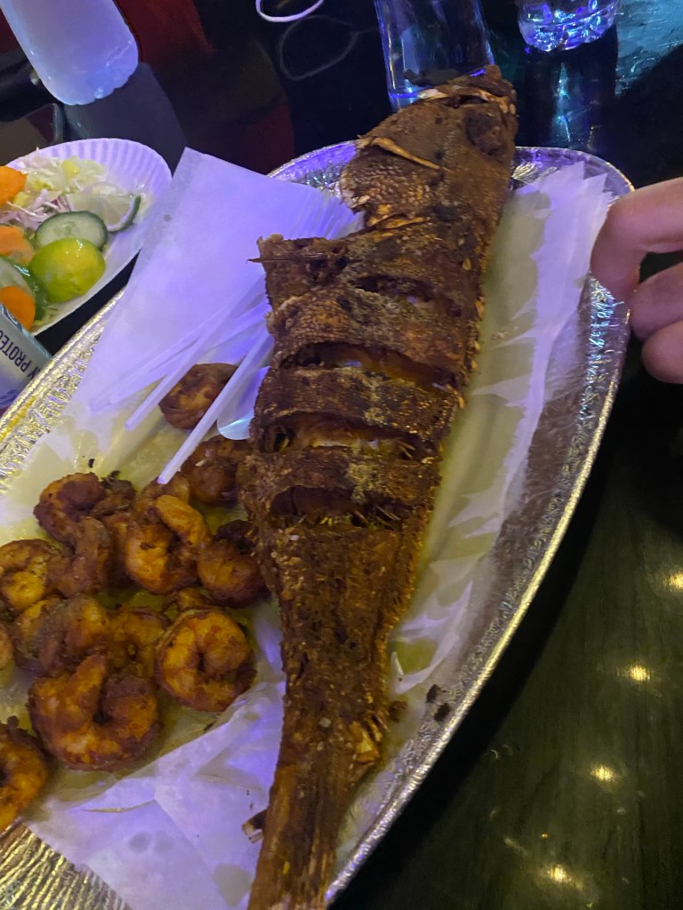 You get there, you immediately go to the kitchen and pick your fish or prawns of the day, it’s all fresh, and everything is marinated in this delicious curry/ chili paste, and then deep fried … then you pick your table and wait. Once you get your fish you can also add rice , naan bread and this curry soup to add for extra flavor.. yeah. It was great!