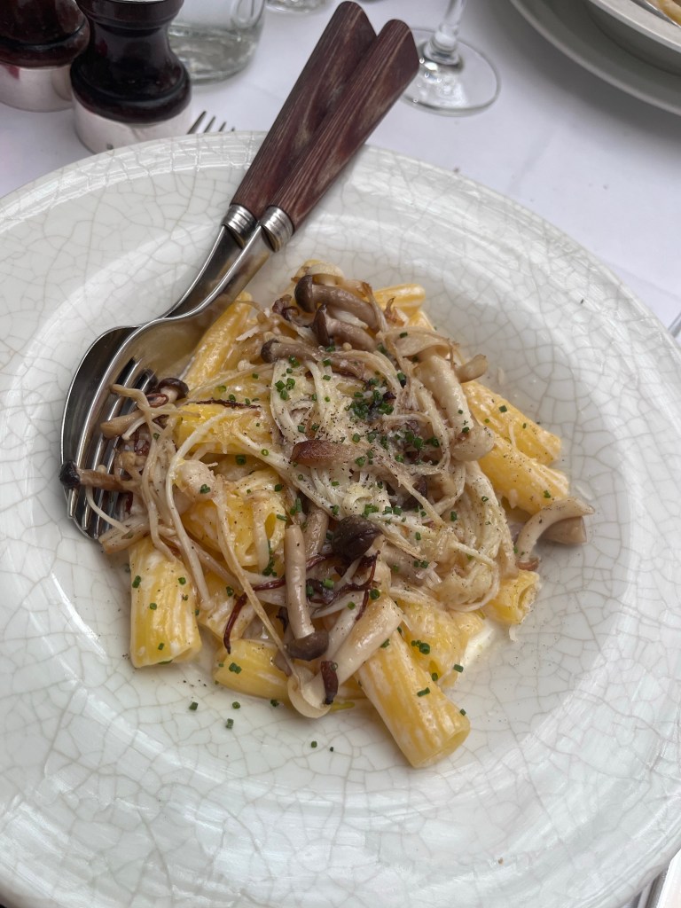 Creamy rigatoni mushroom pasta and pickled beetroots to start. It was fabulous.